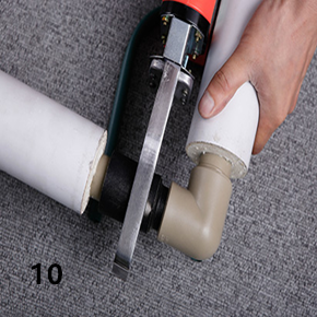 (三)將切出PPR管頭與PPR配件內孔熔接線對比,用筆在管頭處標繪出合適的熱熔深度。連接時,無旋轉的把管頭插入加熱模頭內,插入到所標志的深度,同時無旋轉的把配件推到加熱管上,達到標繪處。一般可用心中默數(shù)數(shù)字法掌握加熱時間,或觀察管件、管材的加熱程度,當模頭上出現(xiàn)一圈PPR熱熔凸緣時,即可將管材、管件從模頭上取下,迅速轉地直線均勻插入到所標深度,使接頭處形成凸緣。